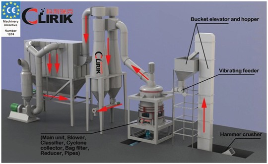 The high –pressure air blower constantly inhale the air in the machine, the airflow with crushed materials are brought to the high-speed impeller of the classifier, the high seed impeller will screen the airflow, the unqualified powder will fall down and return to the mill to de re-grinded. The qualified powder mixed with airflow will go into the cyclone powder collector.