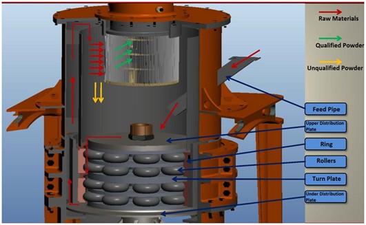 The materials crushed by crusher being sent to the upper distribution plate by vibrating feeder and sloping feeding pipe. When the grinding mill is at work, the main bearing and the turn plate are driven by the electric motor through reducer, all the grinding rollers will roll in the ring channel driving by bearing through plunger, material in the upper distribution plate will be driven in the edge of the turn plate By centrifugal force and fall down into the grinding chamber, where the materials will be pressed, crushed and grinded by rollers repeatedly